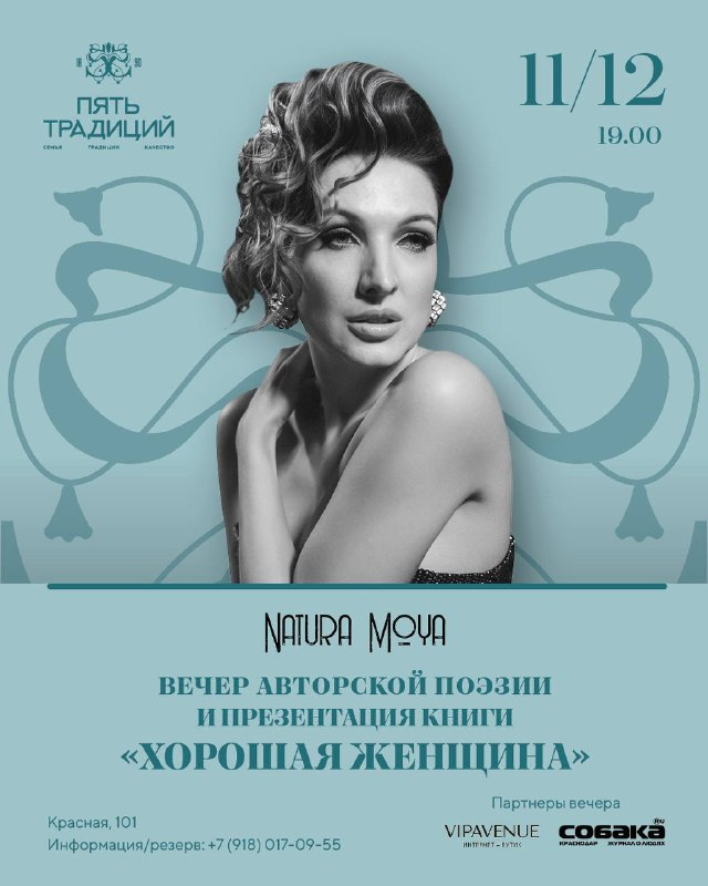 И уже 11 декабря мы приглашаем вас на первый ВЕЧЕР АВТОРСКОЙ ПОЭЗИИ Natura Moya «Традиции и люди». На мероприятии будет представлена первая книга поэтессы «Хорошая женщина». Гостей ждет праздничный фуршет, живое общение, автограф-сессия, розыгрыш от партнера.