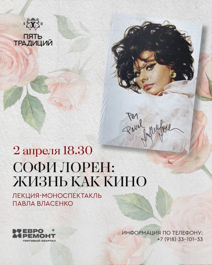 Приглашаем вас на атмосферную лекцию-моноспектакль историка Павла Власенко, посвящённую одной из самых блистательных звёзд мирового кинематографа — Софи Лорен.